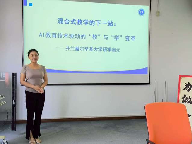 邓爽老师就“芬兰项目学习模式”进行了主题分享,介绍了芬兰高等教育在混合式教学方面的先进理念、教学模式和课程设置特点,利用AI教育技术驱动教学变革,为教师们带来了先进的启示。