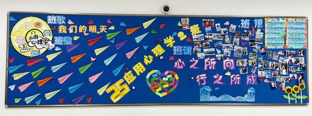 亮点:蓝色底板铺展青春画卷,彩色纸飞机与班级合影交织梦想与记忆,班歌《我们的明天》回荡于心。