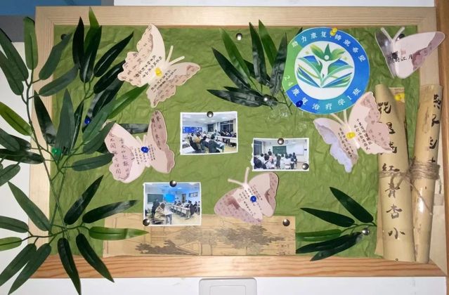 该班以绿色为基调,展板上方悬挂班徽标志,内含绿色植物图案,象征着生命的蓬勃与成长。多张班级活动照片记录了同学们的日常点滴和集体生活,两侧饰以绿植和蝴蝶剪纸,增添自然韵味,右侧还悬挂两卷竹简,寓意青春与希望,整体富有创意,充满青春活力。