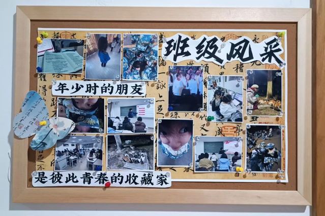 该班展板上陈列了多幅班级活动照片,既有全体同学的欢乐合影,也有同学激情演讲的精彩瞬间,还有校园角落的美丽风光,全面展现了班级的活力与风采。下方张贴的班级课程表,详细列出了本学期的课程名称、上课时间、上课地点等关键信息,一目了然,班级管理有序。