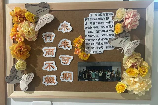 该班以“手可摘星辰”为励志主题,彩色纸张拼贴出鼓舞人心的文字,展现大家的昂扬斗志。手绘海报以鲜明话语,激励同学保持积极的心态。展板上飘扬的五星红旗,更是传达出深厚的爱国情怀,激励着学生们不断追求卓越,勇攀高峰。