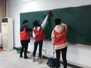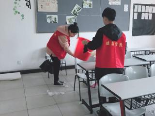 我院参加活动的全体人员准时齐聚,以月华楼为中心,分成若干小组,分散到各个教室进行大扫除的活动,包括地面卫生、桌肚的清理以及桌椅的摆放。同学们手拿扫帚和拖把,拖着垃圾桶,认真仔细地进行清扫工作。他们不怕脏,不怕累,互帮互助,留下一间间干净整洁的教室。尽管天气还有点寒冷,但是同学们的心里都暖洋洋的。