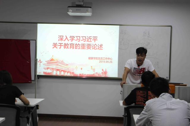 为提高健康学院党员及入党积极分子的党性,健康学院党总支于2019年9月25日下午16:20在天华楼258开展主题为《新学期全体积极分子工作动员大会》暨《深入学习习近平关于教育的重要论述》学习会议,本次会议由健康学院党总支副书记周建光老师主讲、应用心理学专业党支部书记刘卫卫老师、新生辅导员徐红娟老师、孙玺瑞老师、张子璠老师及各位党员、入党积极分子参与此次学习会。