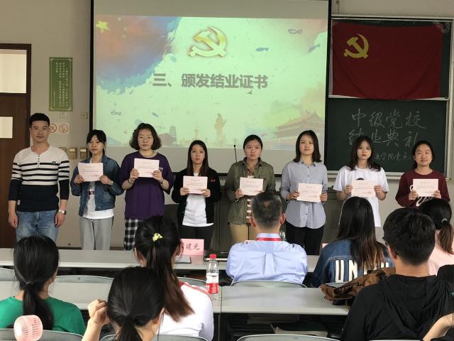 接着由王琦同学宣读了本次中级党校的优秀学员名单,由蔡勇永老师、周建光老师、黄璐老师和刘卫卫老师为在中党学习中表现优异的同学们颁发荣誉证书,其中,来自17应用心理学1班的乐雨晗同学与16应用心理学1班的何萧引同学作为优秀学员代表为同学们分享在本次中党学习中的收获与学习心得。她们表示虽然课程已经结束了,但是更重要的是将所学习到的党的精神发挥到日常的生活和工作中,努力做到为人民服务。