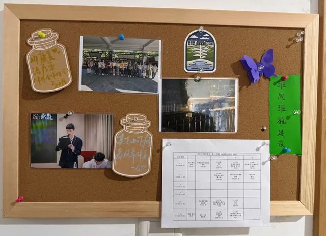 该班展板上陈列了多幅班级活动照片,既有全体同学的欢乐合影,也有同学激情演讲的精彩瞬间,还有校园角落的美丽风光,全面展现了班级的活力与风采。下方张贴的班级课程表,详细列出了本学期的课程名称、上课时间、上课地点等关键信息,一目了然,班级管理有序。