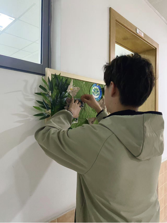 该班以绿色为基调,展板上方悬挂班徽标志,内含绿色植物图案,象征着生命的蓬勃与成长。多张班级活动照片记录了同学们的日常点滴和集体生活,两侧饰以绿植和蝴蝶剪纸,增添自然韵味,右侧还悬挂两卷竹简,寓意青春与希望,整体富有创意,充满青春活力。