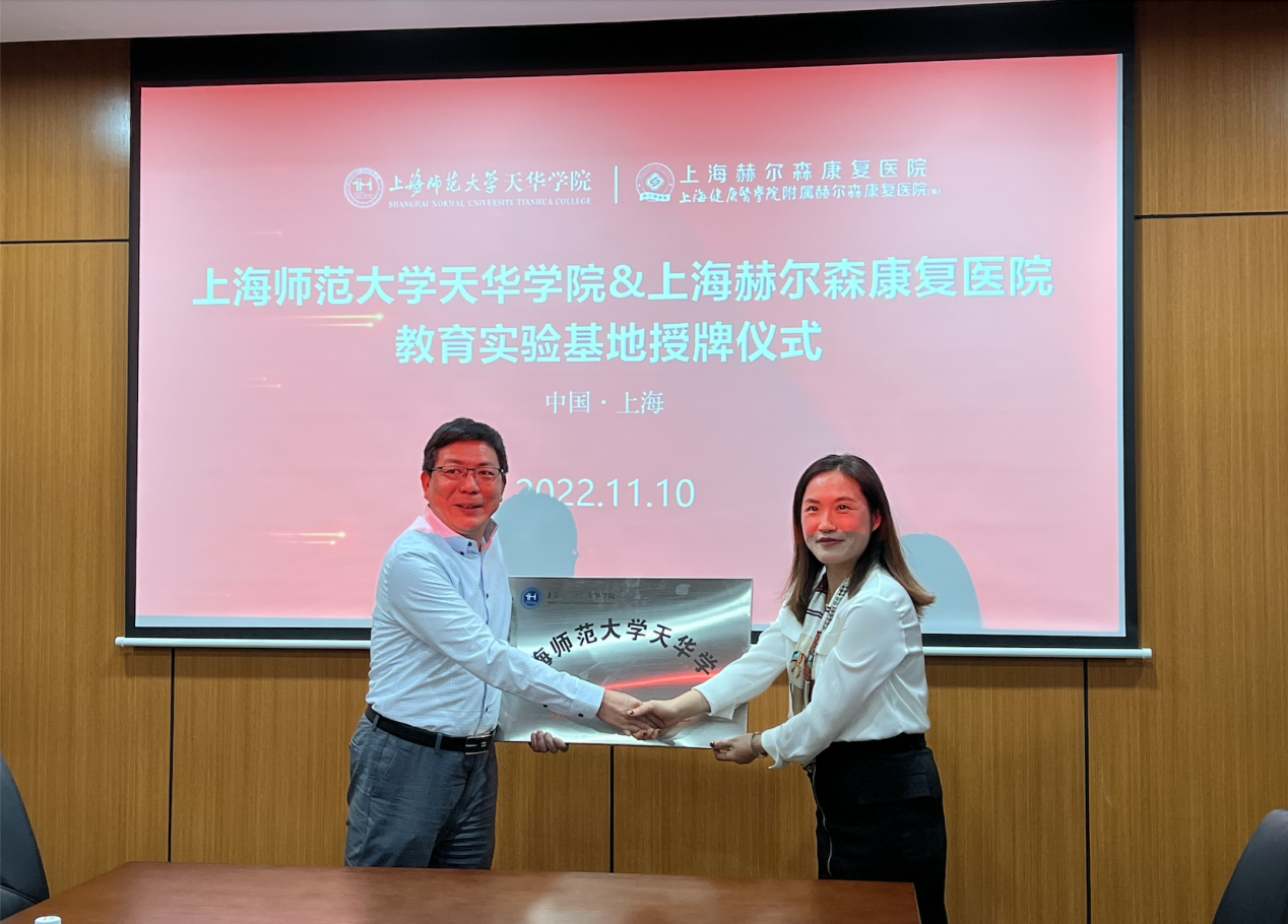 为进一步加强和创新医教研协同发展的医疗人才培养模式,强化高校和医院教育实践合作关系,2022年11月10日下午13时,上海师范大学天华学院健康学院副院长刘敏、实习实训主任刘吉辉、康复治疗学专业教师邓爽和孟赛一同前往上海赫尔森康复医院参加了教学实践基地授牌仪式。出席此次仪式的还有上海赫尔森康复医院院长沈祥开、副院长王良意及相关职能科室负责人。