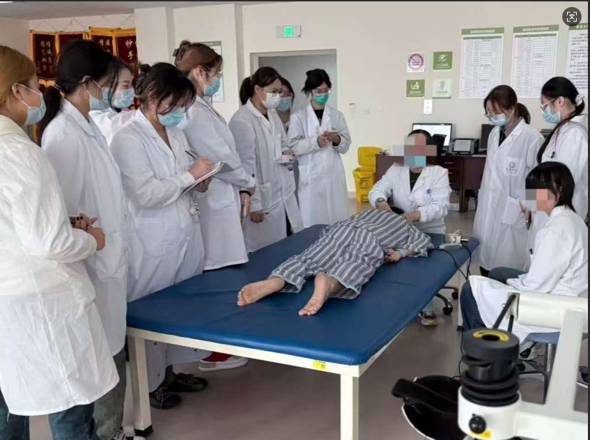 见习期间,医院为同学们安排了系统而丰富的临床观摩与学习内容。在康复医学科,带教老师为学生们现场讲解了悬吊系统、步态训练机器人、经颅磁刺激仪等先进康复设备的原理与应用,并指导学生观察不同病种患者的康复治疗全过程。在神经康复区,带教老师通过一例脑卒中后偏瘫患者的康复训练,现场演示了如何将心理疏导与功能训练有机结合,生动展现了康复治疗中“人文关怀”与“技术干预”并重的专业理念。在作业治疗室,学生们认识到康复的最终目标是让患者回归生活,治疗师通过模拟穿衣、进食等日常活动,帮助患者重拾生活能力的细节给学生留下了深刻印象。