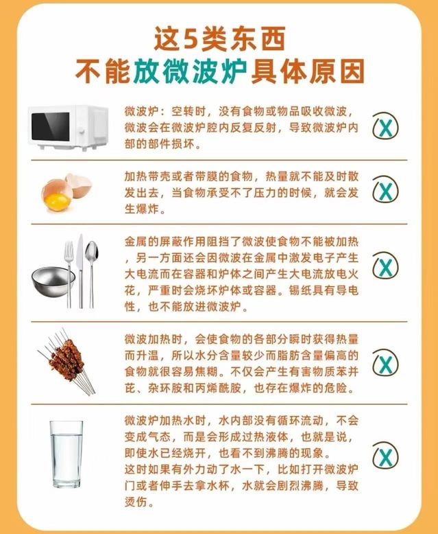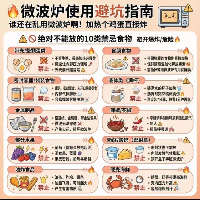 整颗鸡蛋、未开封饮料、密封盒、罐头、带壳坚果等,受热膨胀易炸裂,存在严重安全隐患。