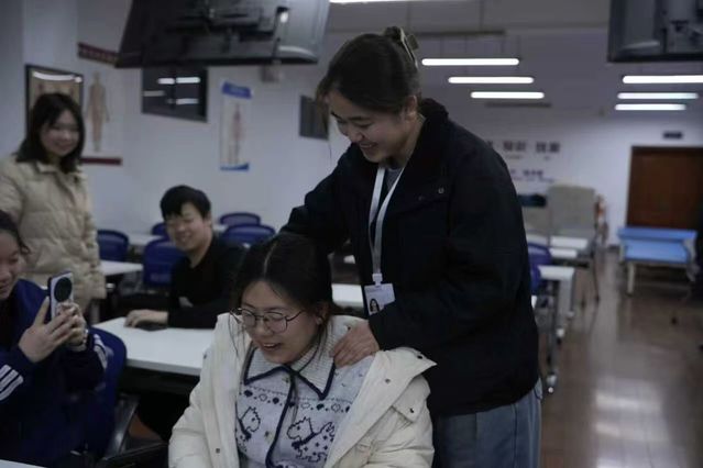 实操环节采用两人小组模式:志愿者通过现场教学、一对一纠正的方式,细心指导同学们把控按摩手法力度、找准关键穴位,确保每位同学都能掌握正确的肩颈按摩技巧,有效缓解肩颈疲劳。