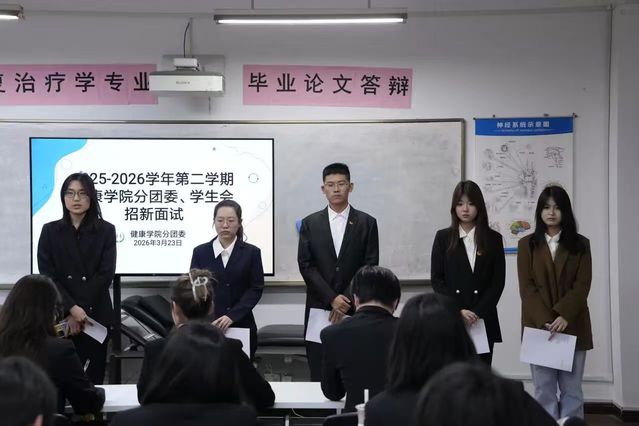 为进一步加强学院学生组织建设,吸纳优秀青年力量,提升学生服务与自我管理能力,健康学院分团委、学生会于2026323日下午16:30在天华楼260开展招新面试工作。健康学院分团委书记冯泽茜、主席团成员及各部门正副部长共同担任本次面试官。