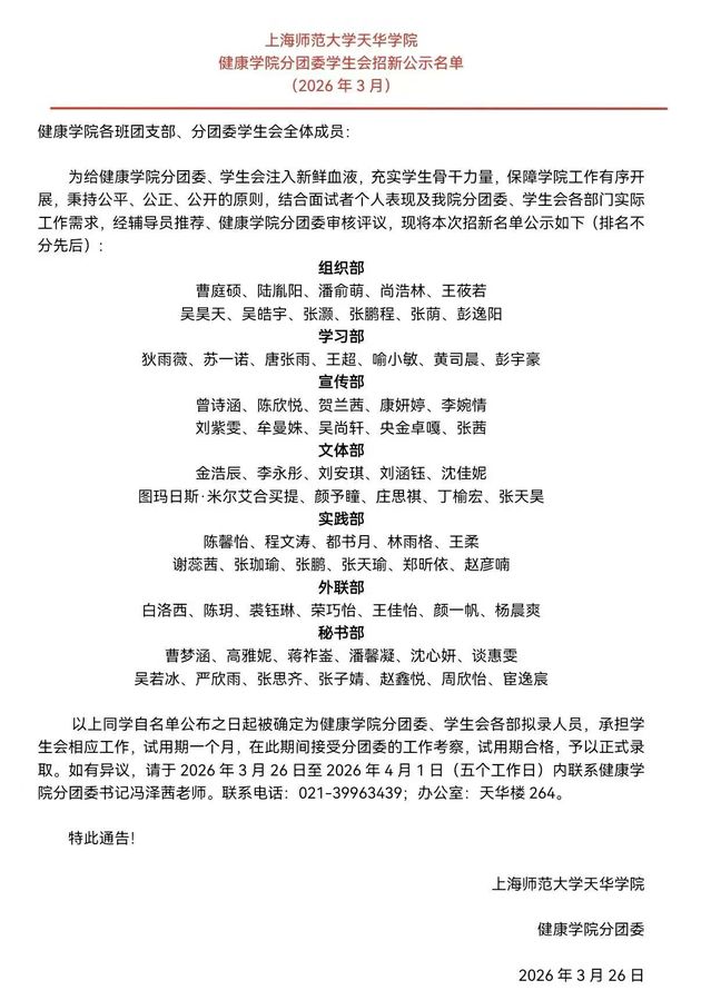 恭喜以下同学通过本次招新面试,以实习生身份加入健康学院分团委、学生会大家庭!公示如下: