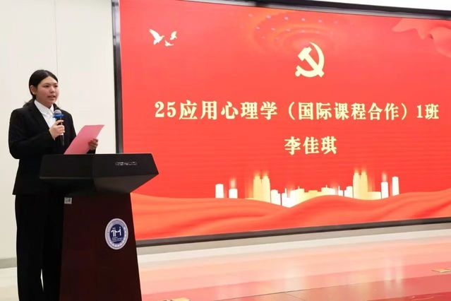 25级应用心理学(国际课程合作)1班李佳琪作为优秀学员代表发言。她回顾了为期三周的党校学习历程,分享了在理论学习中坚定信念、在交流研讨中提升思想、在实践磨砺中锤炼品格的成长感悟。她代表全体学员承诺,将牢记专业初心,把个人成长融入健康中国建设大局,以实际行动积极向党组织靠拢。